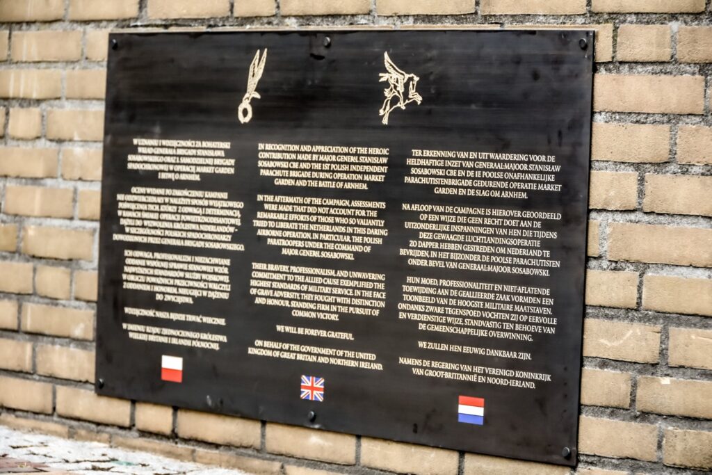 W UZNANIU I WDZIĘCZNOŚCI ZA BOHATERSKI WKŁAD GENERAŁA BRYGADY STANISŁAWA SOSABOWSKIEGO ORAZ 1 SAMODZIELNEJ BRYGADY SPADOCHRONOWEJ W OPERACJI MARKET GARDEN I BITWIE O ARNHEM.